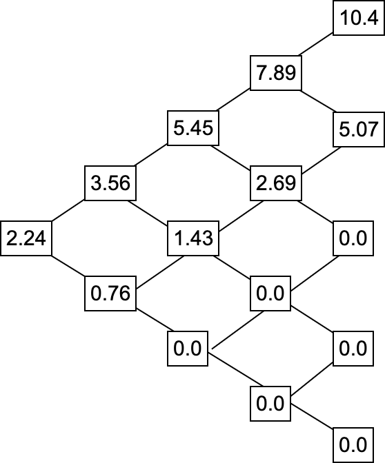 Note that in our example, . So the chance of the upward move is roughly . For each node in the tree that is not a leaf node, the following is computed: