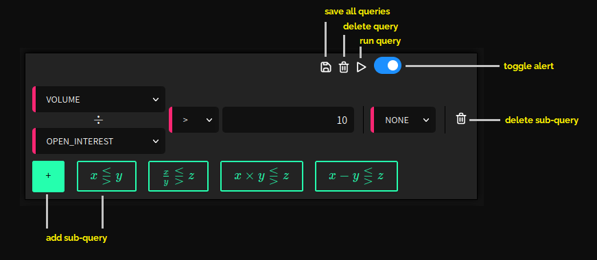 Each query can have up to 20 sub-queries. In the figure above there is just one sub-query (a division query, since the two fields volume and open interest are divided), but more can be added by clicking the plus button and then selecting one of the four sub-query types. For now, there are four types: A simple comparison with a threshold (e.g. volume>100volume > 100), a division query (e.g. volumeopen_interest>10\frac{volume}{open\_interest} > 10), i.e. the two selected KPIs are divided, a multiplication query (volume×close>10volume \times close > 10), and a subtraction query (good for spreads: askbidask - bid). Sub-queries can be deleted again.