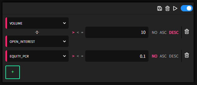 The above option alert query contains two sub-queries. You can add up to 20 sub-queries, but be aware that these are 'AND' queries. E.g. if you have two sub-queries, theta < -0.5 and gamma > 0.5, the system will look for options that fulfill both sub-queries at the same time. Thus, by adding more sub-queries, you further determine what options you look for and potentially decrease your total number of options you can find. 'OR' queries would be the other side, but this is not supported. Note that this limit of 20 sub-queries can be increased by contacting us.
